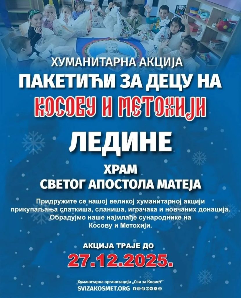 U Hramu Svetog Apostola Mateja na Ledinama pokrenuta je velika humanitarna akcija prikupljanja slatkiša, slaniša, igračaka i novčanih donacija za decu na Kosovu i Metohiji. Cilj akcije je da se uljepša praznični period najmlađim sunarodnicima koji žive u otežanim uslovima.Organizatori pozivaju sve ljude dobre volje da se priključe i pomognu da što više mališana dobije svoj novogodišnji paketić. Akcija traje do 27.12.2025. godine.