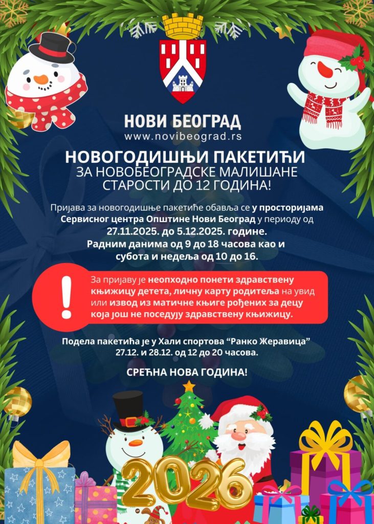 Gradska opština Novi Beograd i ove godine organizuje podelu novogodišnjih paketića za sve mališane sa svoje teritorije uzrasta do 12 godina.