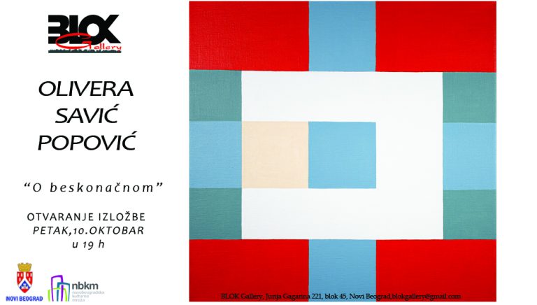 U Blok galeriji na Novom Beogradu, u ulici Jurija Gagarina 221, u petak, 10. oktobra, sa početkom u 19 časova, biće otvorena izložba slika pod nazivom „O beskonačnom“ autorke Olivere Savić Popović. Postavka će biti dostupna posetiocima do 22. oktobra.…