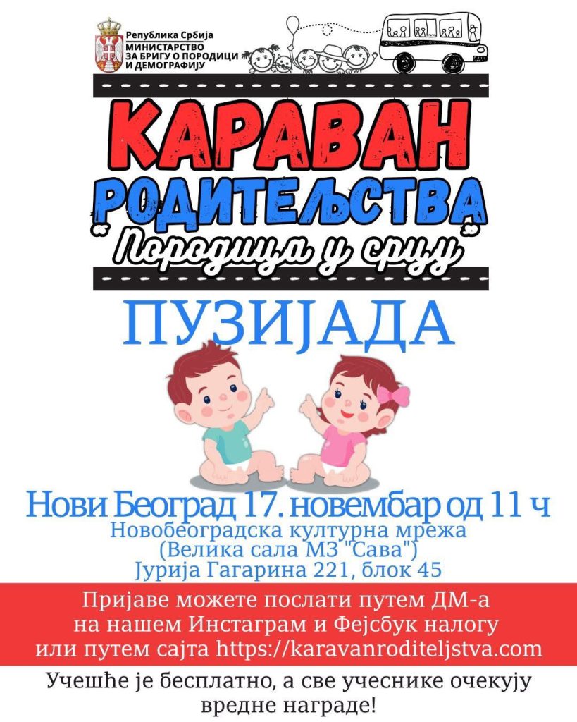 U ponedeljak, 17. novembra, Novobeogradska kulturna mreža (NBKM) u Jurija Gagarina 221 ugostila je Karavan roditeljstva Ministarstva za brigu o porodici i demografiju Republike Srbije, manifestaciju posvećenu porodici, roditeljstvu i najmlađima.